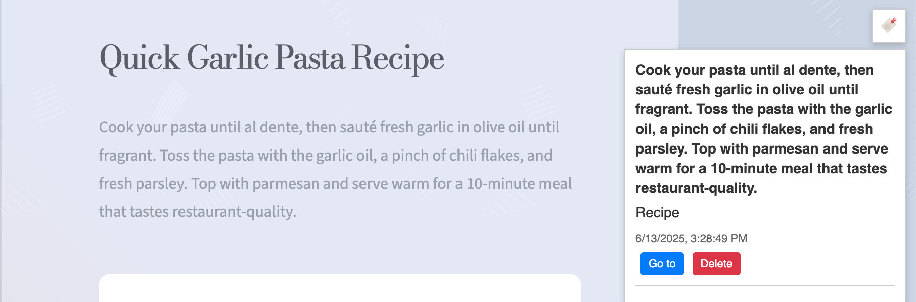 Save recipes, research, quotes, or highlights in one click β then revisit anytime.