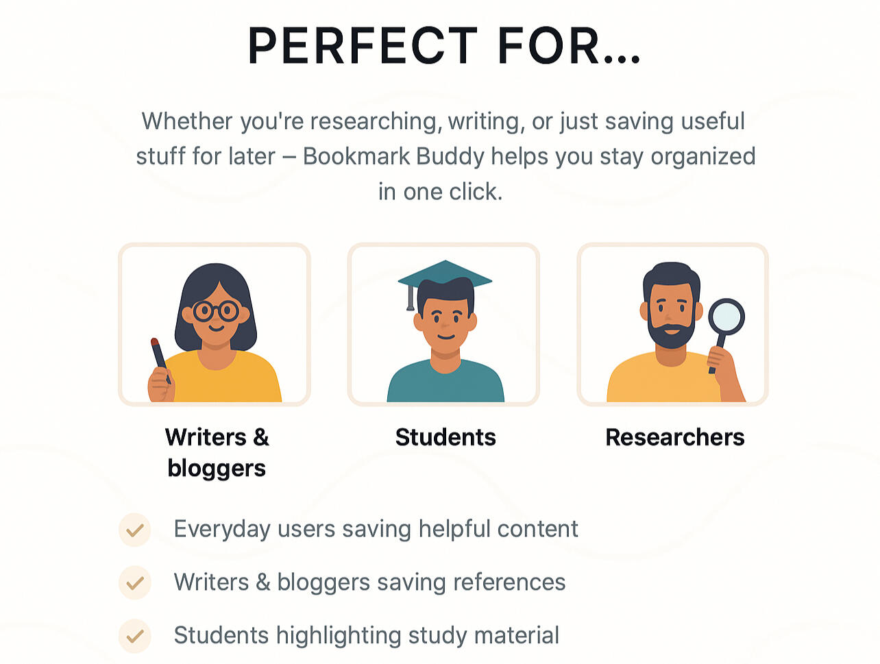 Bookmark Buddy makes it easy to save parts of any webpage with just a highlight. No clutter. No tabs. Just what you need, when you need it.